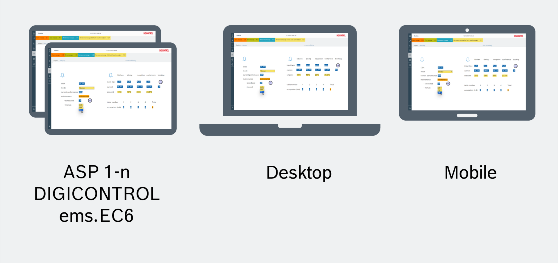 Operate and monitor your plants and rooms from the touch panels inside the control cabinets (automation and control equipment rooms), from your PC in the office and from your mobile devices, regardless of where you happen to be.