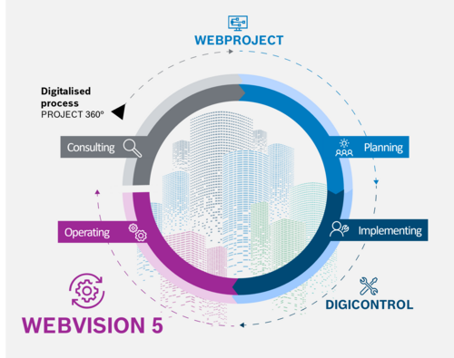 Our view of building automation solutions begins, like the life cycle of modern real estate, with innovative project development and digitalized system engineering using WEBPROJECT and extends from the construction of your BA systems with DIGICONTROL up to the integrated building management system WEBVISION 5.