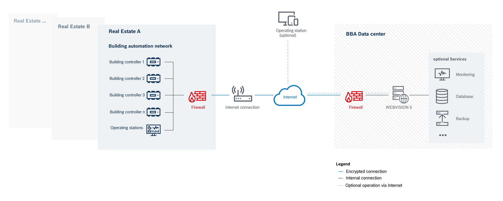 WEBVISION 5 as a Service includes the comprehensive building management system (BMS) as a cloud service with connection to the automation systems within the buildings and properties via secure and encrypted communication - freely scalable and flexibly adaptable to the increasing and future needs of owners and operators.