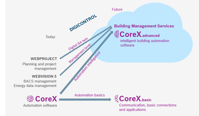Building management systems with technical monitoring and operational optimization as well as tools for analysing building and energy data are of great importance for sustainable, optimal building operation. The WEBVISION 5 management software is used to maintain and increase energy efficiency - CoreX creates it, because the DIGICONTROL software in the controllers of the automation equipment realizes the active implementation of tailor-made automation and integration solutions, energy efficient I&C technology and the optimal interaction of technical systems, rooms and integrated building technology.