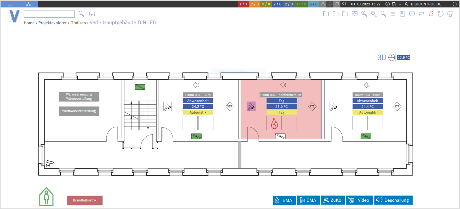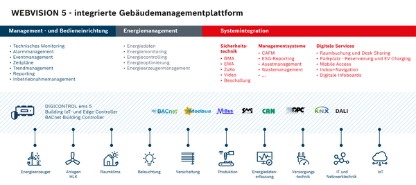 Die integrierten Gebäudemanagementlösungen von WEBVISION 5 ermköglichen das funktionelle Betreiben des Gebäudes von einem einzigen Bedienplatz aus: